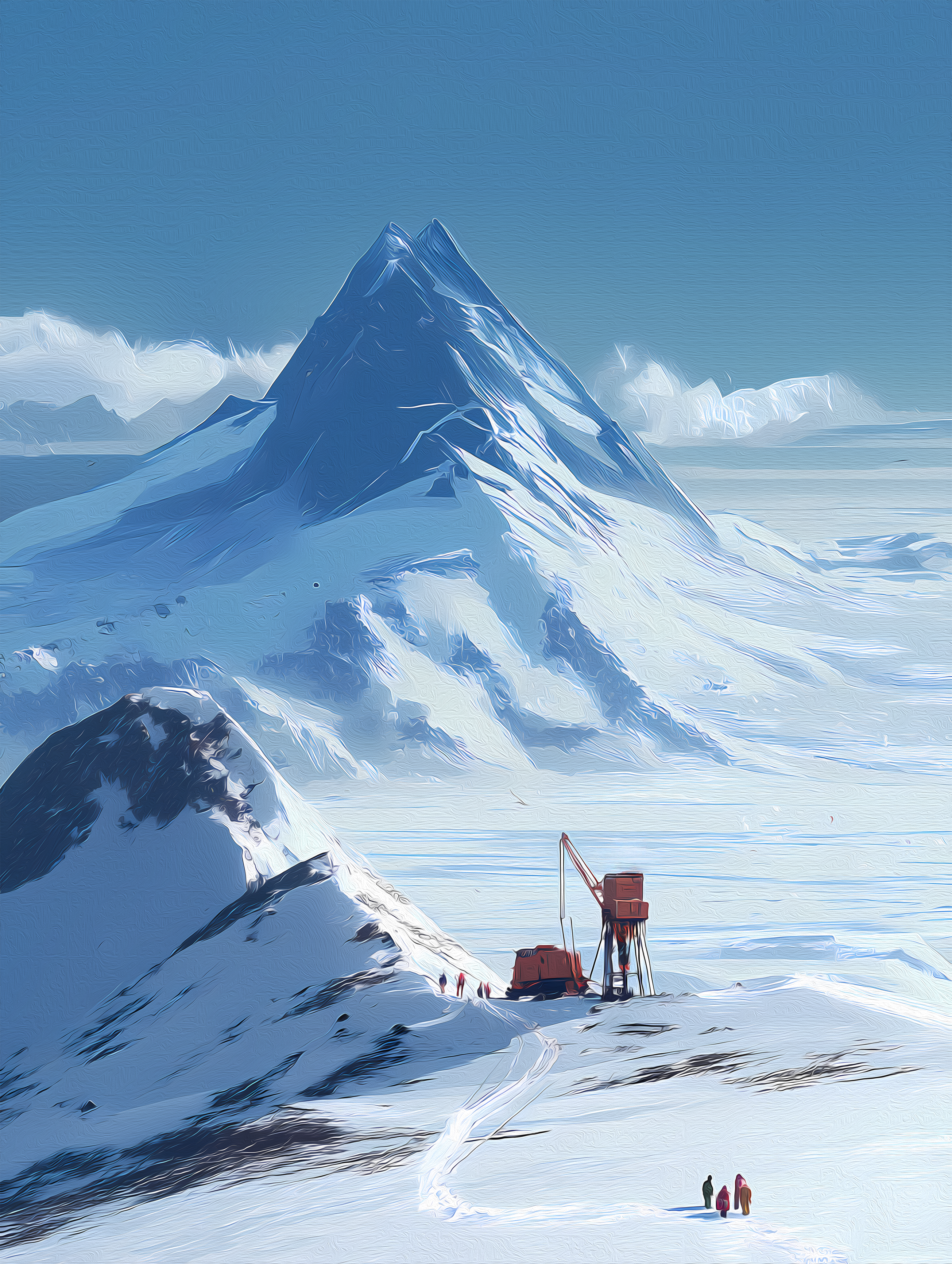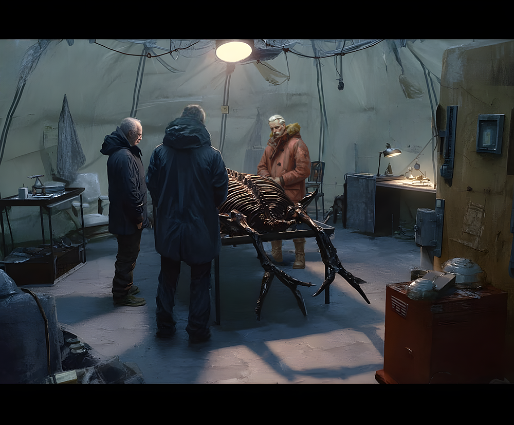 Rather than waiting for that adaptation to happen, we set out to visualize it ourselves. The illustrations in this book are designed as cinematic concept paintings—imagining scenes, environments, and moods as if they were created for a feature film. Each image explores what a modern At the Mountains of Madness adaptation could feel like, blending cosmic horror with a grounded, atmospheric realism.